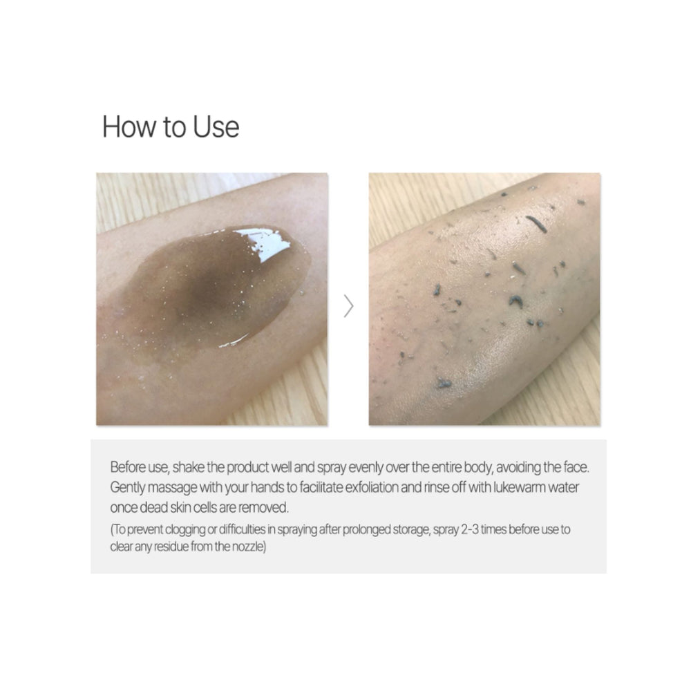 Shake well before use. Spray evenly onto the body, avoiding the face. Massage gently until dead skin rolls away. Rinse thoroughly with warm water. Use as needed to maintain soft and polished skin.