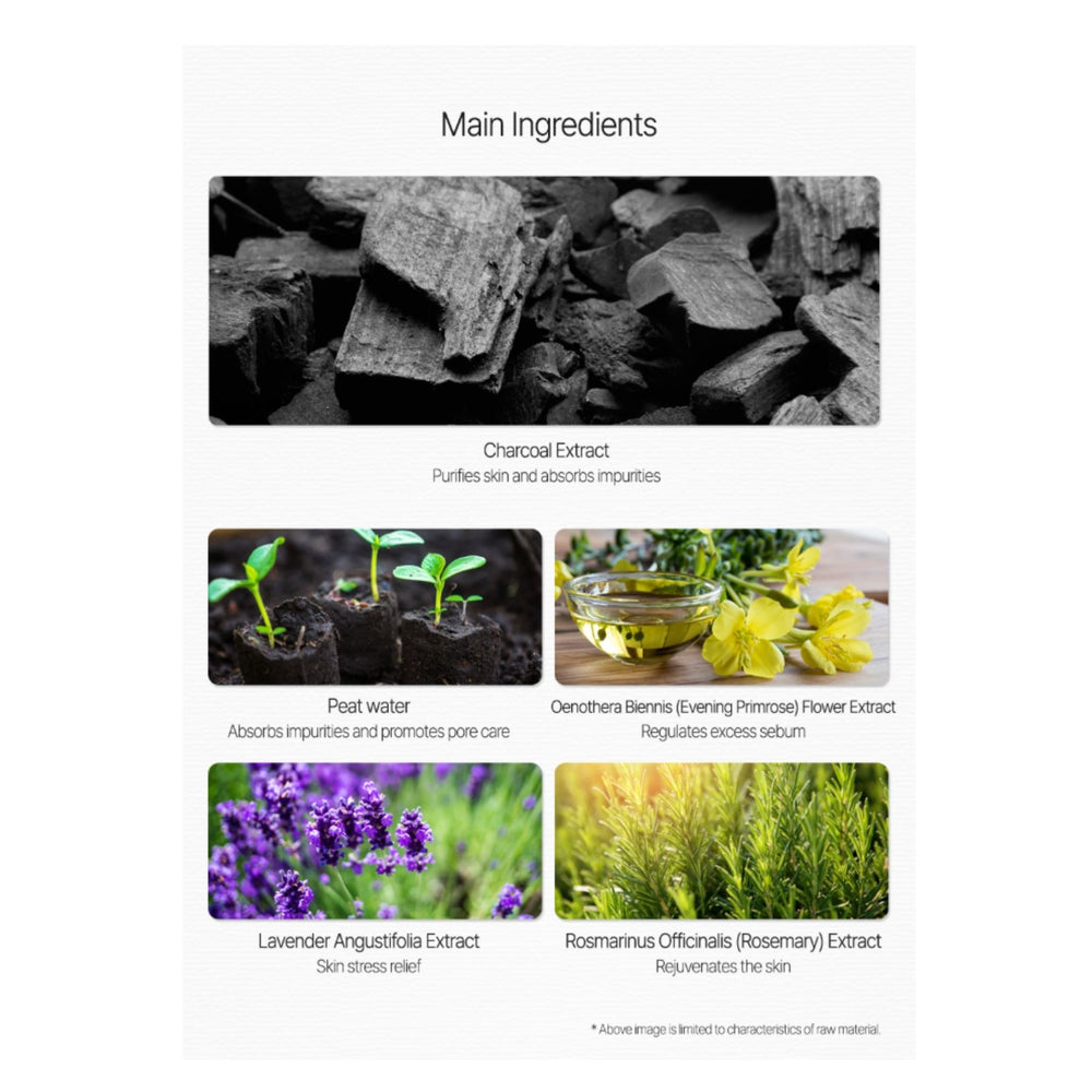 Water, Alcohol Denat., Glycerin, Propanediol, Carbomer, Quaternium-60, Propylene Glycol, Charcoal Extract, Mentha Viridis (Spearmint) Extract, Mentha Rotundifolia Leaf Extract, Mentha Piperita (Peppermint) Extract, Pinus Palustris Leaf Extract, Ulmus Davidiana Root Extract, Oenothera Biennis (Evening Primrose) Flower Extract, Pueraria Thunbergiana Root Extract, Lavandula Angustifolia (Lavender) Extract, Rosmarinus Officinalis (Rosemary) Extract, Origanum Vulgare Flower/Leaf/Stem Extract, Thymus Vulgaris (Thyme) Extract, Ruscus Aculeatus Root Extract, Menthol, Camphor, Peat Water, Acacia Senegal Gum, Citric Acid, Potassium Sorbate, Hydroxypropyl Methylcellulose, Butylene Glycol, Tocopheryl Acetate, Magnesium Sulfate, Ethylhexylglycerin, Cetrimonium Chloride, PEG-60 Hydrogenated Castor Oil, 1,2-Hexanediol, Disodium EDTA, Phenoxyethanol, Fragrance