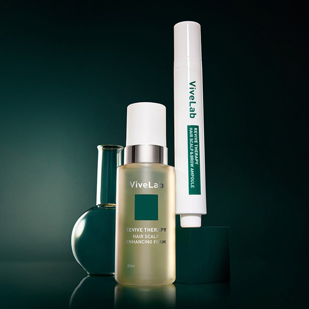 The set includes the Revive Therapy Hair Scalp & Brow Ampoule (15 ml) for daytime use and the Revive Therapy Scalp Enhancing Foam (33 ml) for nighttime care. Working together, they provide comprehensive nourishment, improved follicle resilience, and visible reduction in shedding.