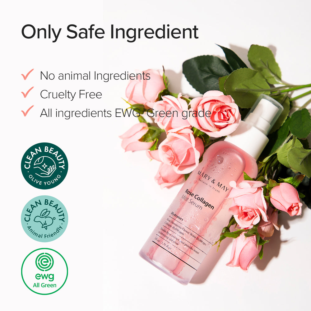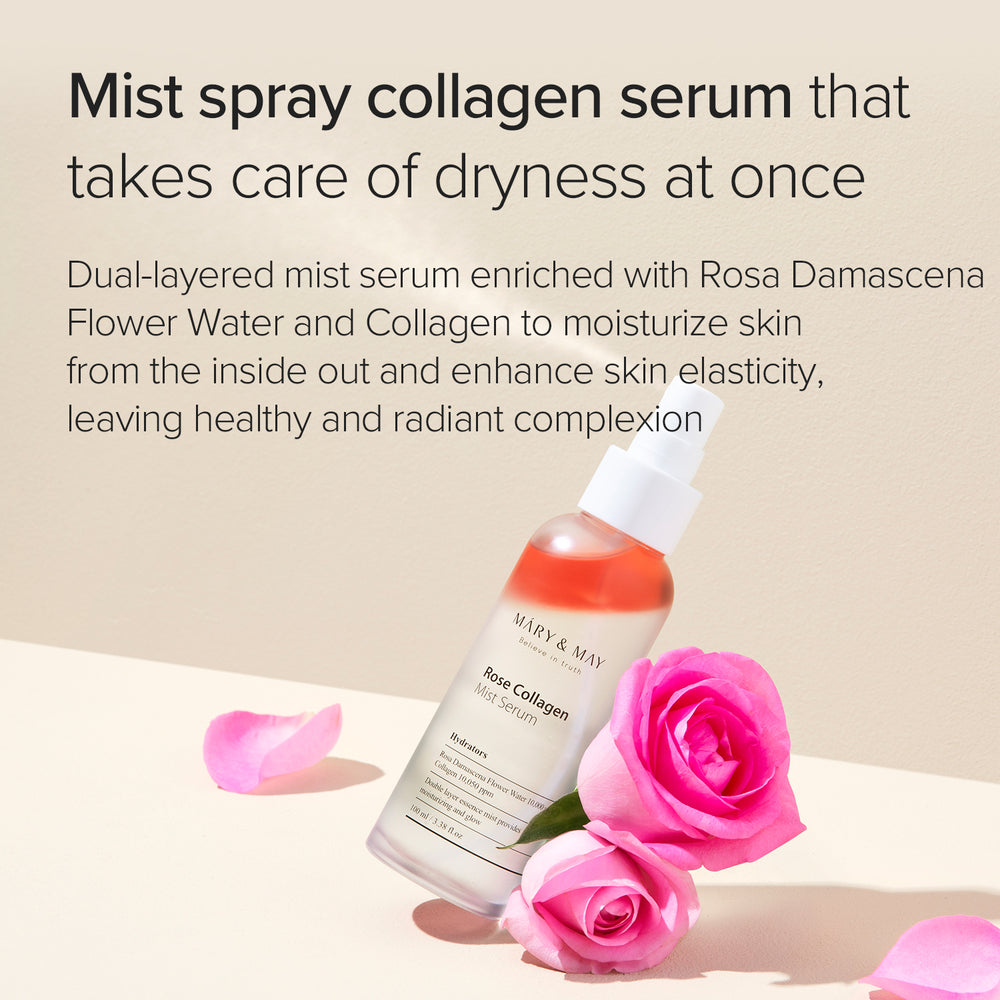Instantly quench dry, tired skin with Mary & May Rose Collagen Mist Serum, a dual-layer hydrating spray that combines the freshness of a mist with the nourishment of a serum.
