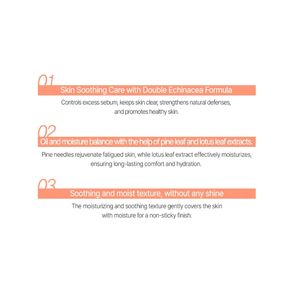 Water,Glycerin,Cetyl Ethylhexanoate,1,2-Hexanediol,Methylpropanediol,Diphenylsiloxy Phenyl Trimethicone,Polyglyceryl-3 Methylglucose Distearate,Caprylyl Methicone,Polyglyceryl-3 Distearate,Cetearyl Alcohol,Carbomer,Palmitic Acid,Butylene Glycol,Stearic Acid,Tromethamine,Glyceryl Stearate Citrate,Ethylhexylglycerin,Ammonium Acryloyldimethyltaurate/VP Copolymer,Disodium EDTA,Parfum,Sodium Hyaluronate,Myristic Acid,Oenothera Biennis Flower Extract,Pueraria Lobata Root Extract,Pinus Palustris Leaf Extract,Ulmus Davidiana Root Extract,Echinacea Purpurea Leaf/Stem/Meristem Cell Culture Extract,Echinacea Angustifolia Root Cell Culture Extract,Melaleuca Alternifolia Leaf Water,Cryptomeria Japonica Leaf Extract,Nelumbo Nucifera Leaf Extract,Saccharomyces Ferment Filtrate