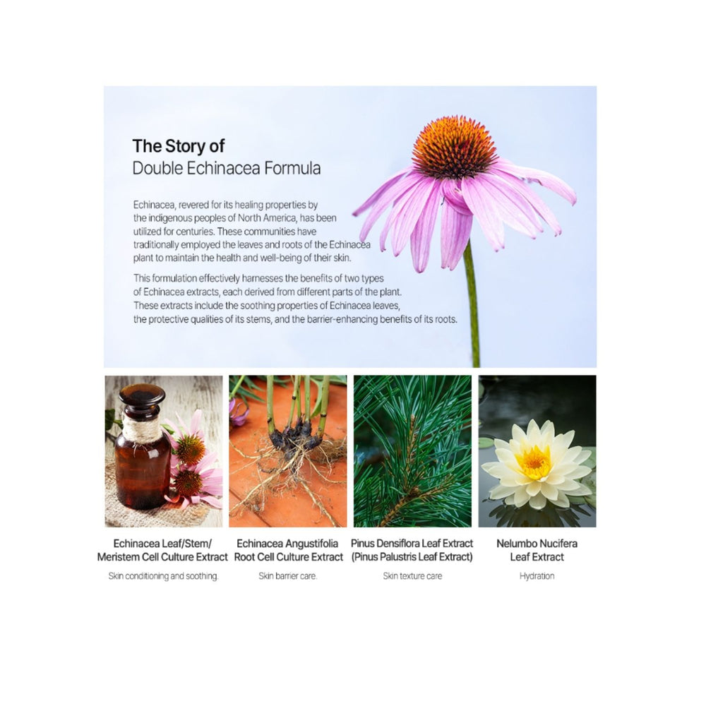 At the heart of the formula are Echinacea Purpurea and Echinacea Angustifolia cell culture extracts, known for their antioxidant and skin-repairing benefits. These plant stem cell extracts help protect the skin from environmental stressors, reduce redness, and promote a healthier, more resilient complexion.