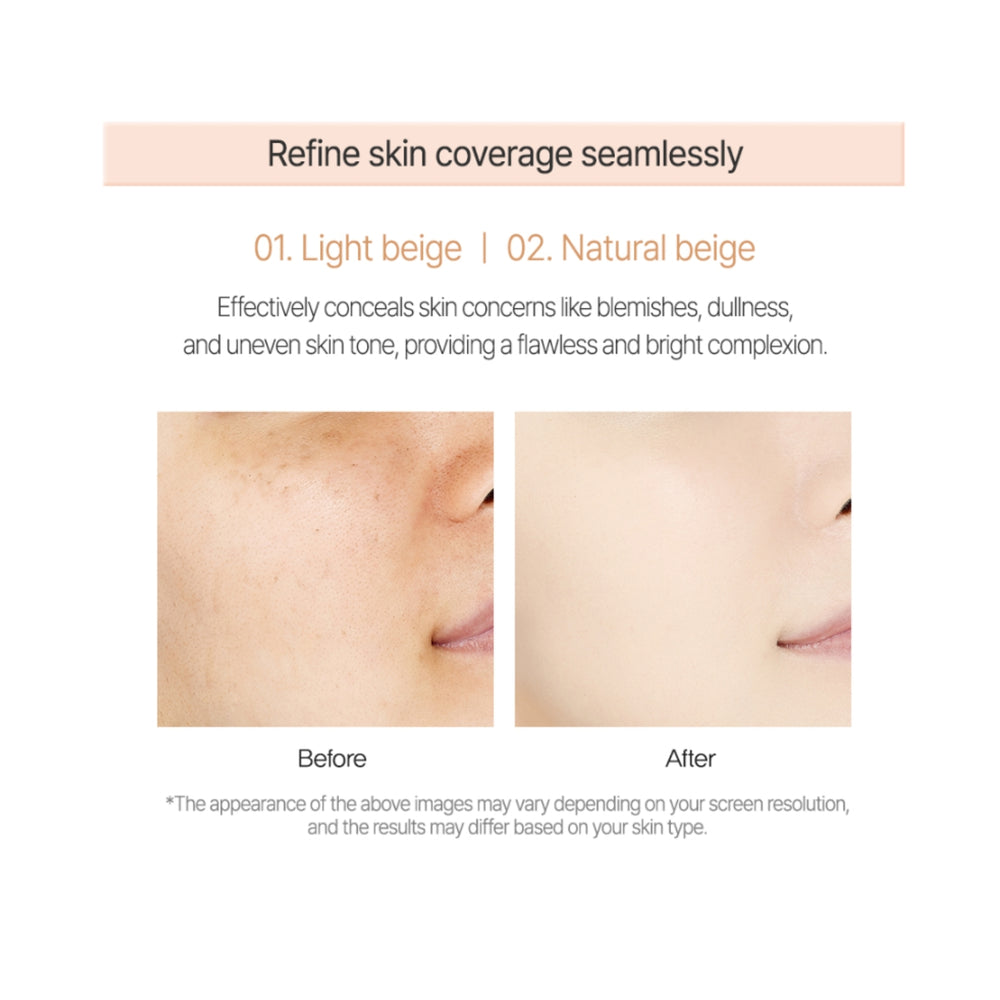 The formula includes Centella Asiatica (Cica), known for its soothing, repairing, and anti-inflammatory properties. Cica helps calm irritation, supports the skin barrier, and assists with fading blemish marks—making this foundation especially beneficial for sensitive or acne-prone skin.