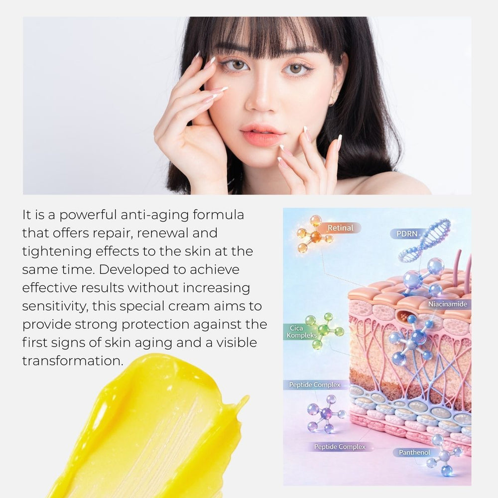 To maintain daily comfort and barrier support, the formula includes 2% Niacinamide and 1% Panthenol, which help improve the look of uneven tone, strengthen the skin barrier, and maintain moisture balance. A soothing Cica (Centella Asiatica) complex helps calm the feel of sensitivity, making this cream suitable even for users new to retinal-based skincare.