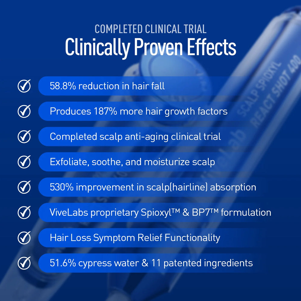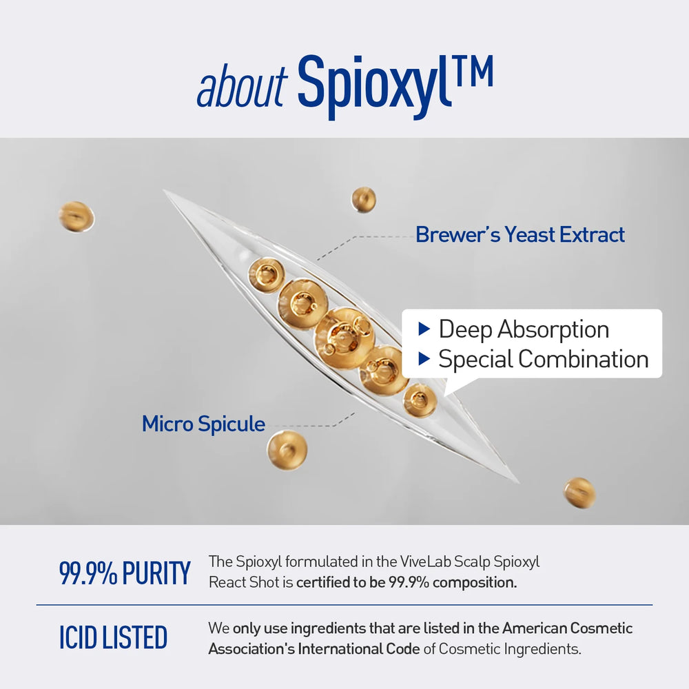 ViveLab Scalp Spioxyl React Shot 400: Water,Alcohol,Caffeine,C12-13 Alketh-9,Artemisia Vulgaris Extract,Ammonium Acryloyldimethyltaurate/VP Copolymer,Dipropylene Glycol,Menthol,Hydrolyzed Sponge,Fragrance,Acrylates/C10-30 Alkyl Acrylate Crosspolymer,Butylene Glycol,Styrene/Acrylates Copolymer,Glycerin,Bacillus Ferment,1,2-Hexanediol,Ethyl Menthane Carboxamide,Aminomethyl propanol,Disodium EDTA,Dipotassium Glycyrrhizate,Methionine,Cysteine,Gardenia Florida Fruit Extract,Saccharomyces Cerevisiae Extract,Brassica Oleracea Italica (Broccoli) Extract,Artemisia Capillaris Extract,Allium Cepa (Onion) Bulb Extract,Polyglyceryl-10 Laurate,Dextrin,Ethylhexylglycerin,Polyglutamic Acid,Biotin,Tripeptide-1,Palmitoyl Pentapeptide-4,Acetyl Hexapeptide-8,Myristoyl Pentapeptide-4,Palmitoyl Tripeptide-1,Carnosine,Rehmannia Chinensis Root Extract,Morus Nigra Fruit Extract,Lycium Chinense Fruit Extract,Berberis Vulgaris Root Extract,Fragaria Chiloensis (Strawberry) Fruit Extract,Cornus Officinalis Fruit Extract,Alisma Orientale Tuber Extract,Dextran,Dioscorea Japonica Root Extract,Smilax Glabra Root Extract,Paeonia Suffruticosa Root Extract,Acetyl Tetrapeptide-3,Trifolium Pratense (Clover) Flower Extract